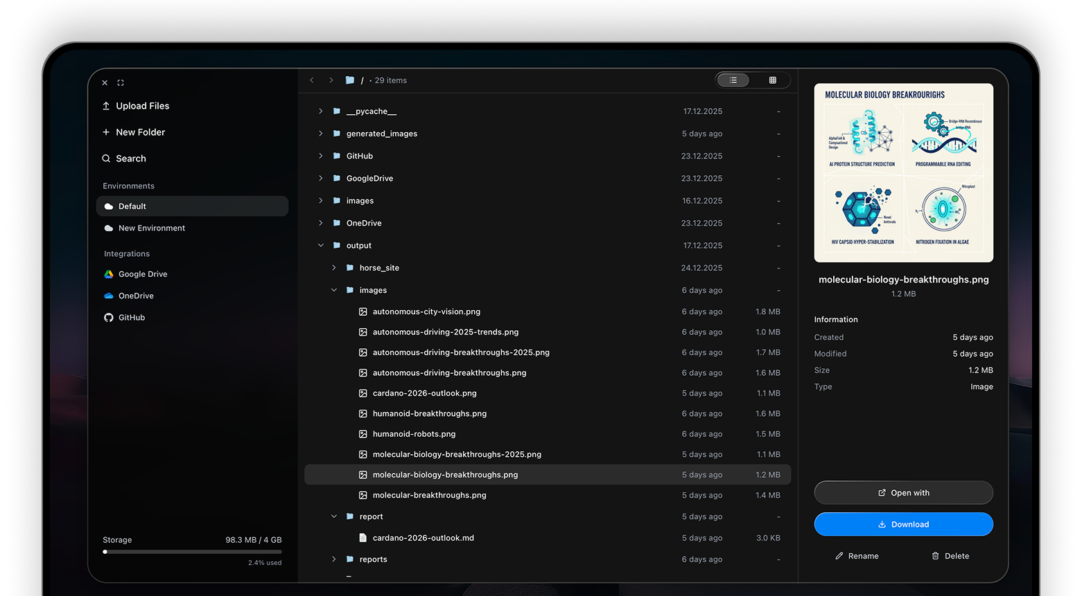 Persistent file storage for every agent. Read, write, and organize files across sessions—no setup required.