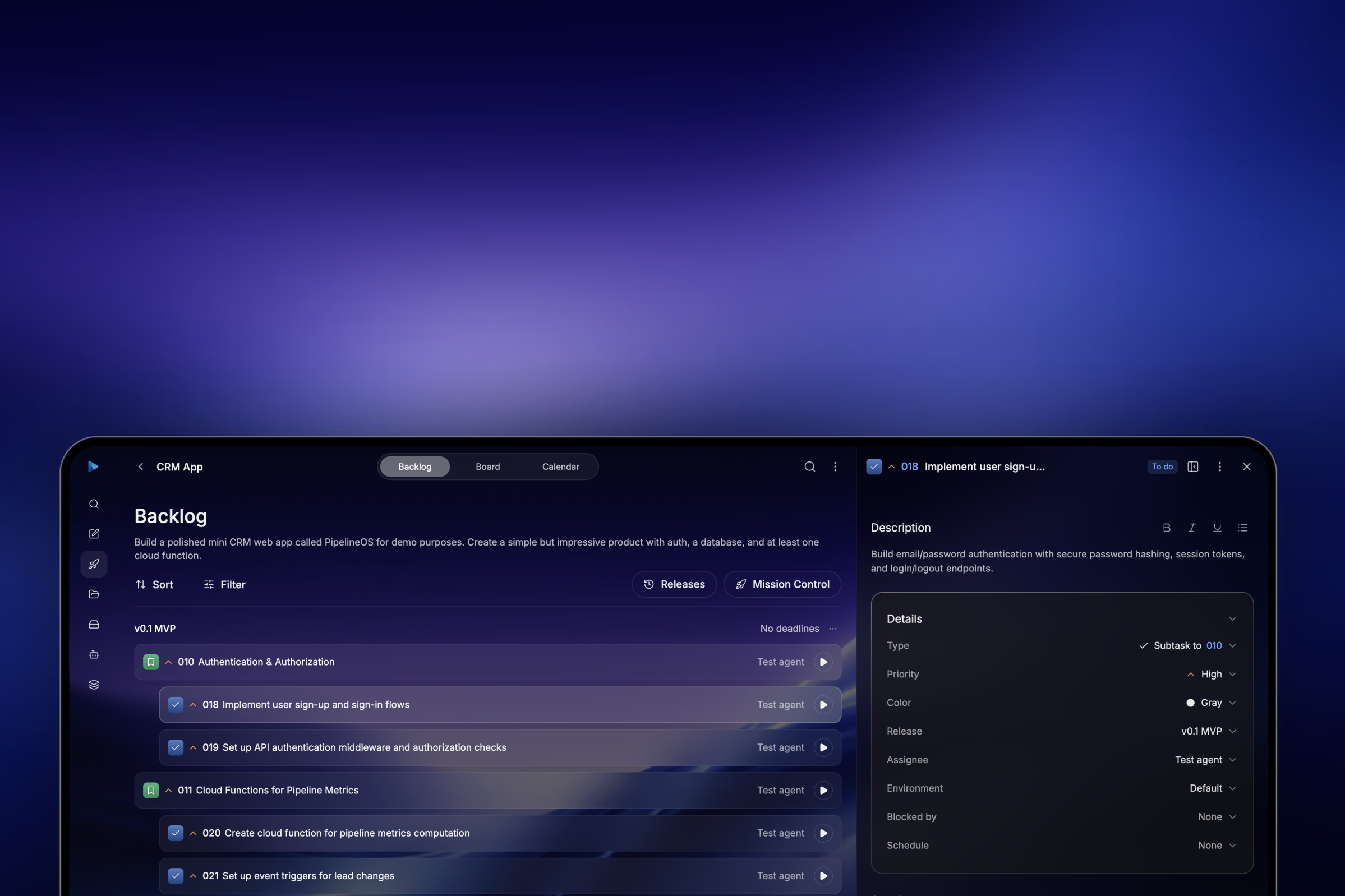 Use mission control, backlog, board, releases, and shared attachments to coordinate agent execution inside one product workspace.